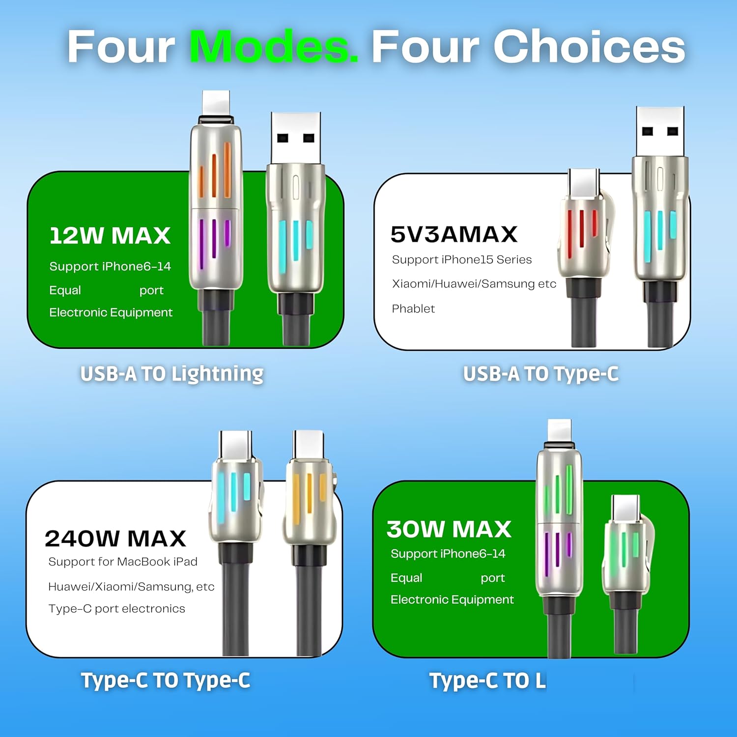 This 4-in-1 USB data cable offers multi-device compatibility, allowing you to easily connect to a variety of electronic devices. We provide a 5-year warranty service. If there is a problem with the product, you can get a new replacement by just paying the shipping fee. Professional design ensures stable transmission and fast charging, making it an ideal choice for your daily digital life.